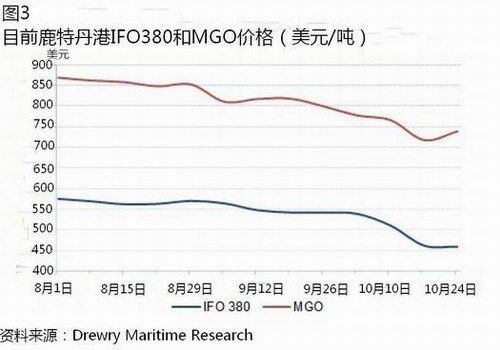 目前在鹿特丹,MGO的價格比IFO 380大約高出280美元/噸(圖3)。然而,沒有人知道,到2015年1月份,MGO將維持在目前的價格,還是會應對更高的行業需求而比其他類型燃油的價格上漲得更快。