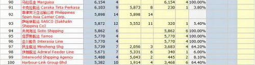 而在中國大陸的班輪公司中,中遠集運排第6位,中海集運排名第7位,海豐國際排名第24位,泉州安盛船務排名第27位,中谷海運排第29位,中外運集運排名第35位,上海海華輪船排名第62位,廣西鴻祥船務排在67位,寧波海運排名83位,福建中行運輸排名84位,天津海運排名85位。
