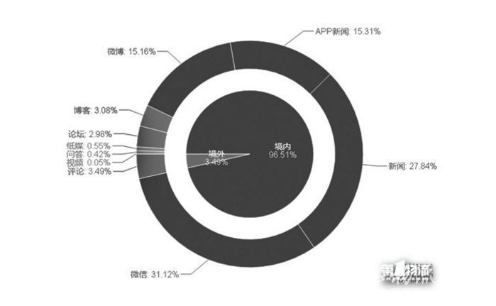 在2017年11月16日至2017年11月23日這段監(jiān)測(cè)周期內(nèi),共監(jiān)測(cè)到243930條相關(guān)數(shù)據(jù)。其中,新聞67910篇,紙媒1350篇,APP新聞37340篇,微信75900篇,微博36980條(含原發(fā)微博7140條,轉(zhuǎn)發(fā)微博29840條),論壇7280篇,博客7510篇,問(wèn)答1030條,評(píng)論8510條,視頻120條。媒體分布中,微信、新聞網(wǎng)站、APP新聞、微博占載播比例分別為31.12%、27.84%、15.31%和15.16%。
