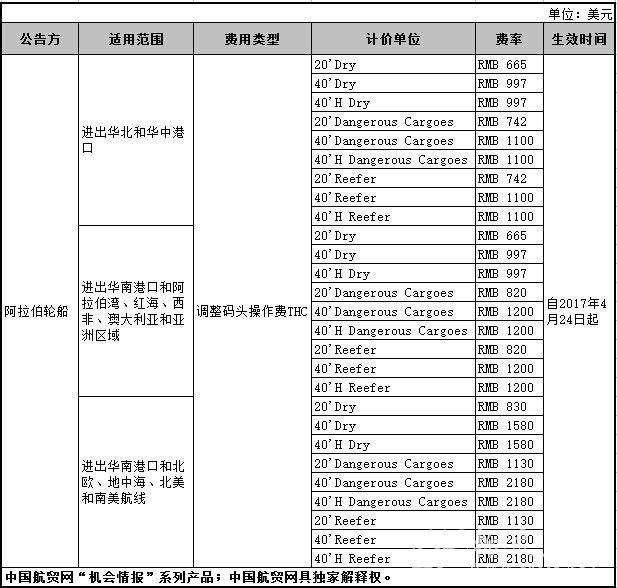 根據記者對船公司運營跟蹤顯示,阿拉伯輪船發布最新碼頭操作費調整計劃,如下所示: