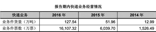“飛”一般的速度。2014年至2016年,德邦物流快遞業(yè)務(wù)收入分別為4.9億元、17.75億元和40.96億元;快遞量分別為1526萬票、6039萬票和1.61億票;毛利分別為-1.46億元、-2.25億元以及2.06億元。