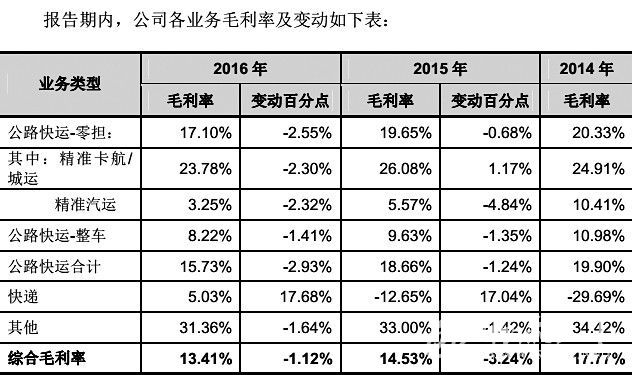 對于精準(zhǔn)卡航/城運(yùn)業(yè)務(wù)與精準(zhǔn)汽運(yùn)業(yè)務(wù)毛利率在2016年下降的原因,德邦表示:
