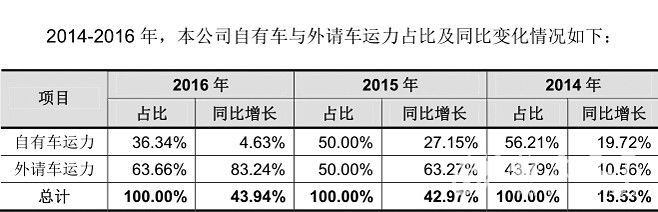 這或有助于德邦物流提升零擔(dān)業(yè)務(wù)的毛利率!墩泄烧f明書》中稱,外請車輛存在成本偏高、服務(wù)質(zhì)量不能完全控制等缺點。未來新購車輛的增加,可進(jìn)一步減少租賃外請車的數(shù)量,并保證提供運(yùn)輸服務(wù)的質(zhì)量!墩泄烧f明書》披露的數(shù)據(jù)顯示,2016年德邦物流外請車輛占比63.66%,同比增長83.24%。而2014年德邦物流的外請車輛僅占43.79%