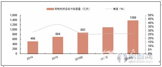 根據(jù)前瞻產(chǎn)業(yè)研究院發(fā)布的《中國智能物流行業(yè)市場需求預(yù)測和投資分析報(bào)告》數(shù)據(jù)顯示,2015年我國智能物流設(shè)備市場容量達(dá)到684億元,2016年為862億元,預(yù)計(jì)2018年將達(dá)到1360億元,年增速在20%以上。