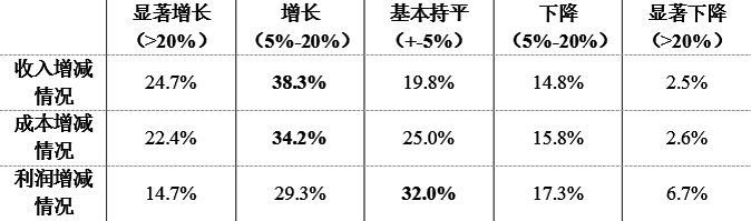 企業(yè)利潤增長幅度慢于收入和成本,32%的企業(yè)利潤增長基本持平,29.3%的企業(yè)利潤增長在5%-20%,14.7%的企業(yè)利潤增長超過20%,還有24%的企業(yè)利潤出現下降,6.7%的企業(yè)利潤下降超過20%。
