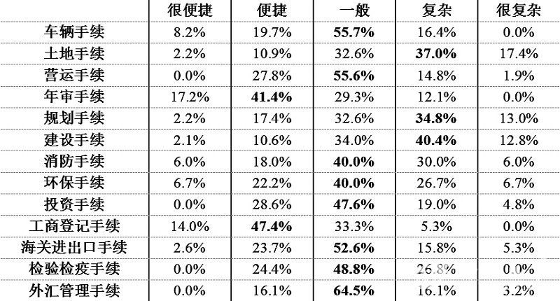 調查顯示,年審、工商登記手續(xù)較為便捷,土地、規(guī)劃、建設、消防、環(huán)保、檢驗檢疫等手續(xù)較為復雜,車輛、營運、投資、海關、外匯管理手續(xù)總體一般。