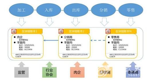 以產(chǎn)品追溯為例。產(chǎn)品追溯是物聯(lián)網(wǎng)技術(shù)的重要應(yīng)用領(lǐng)域之一,目前廣泛應(yīng)用在農(nóng)牧產(chǎn)品原產(chǎn)地追溯,工業(yè)生產(chǎn)的原材料和零配件追溯,以及消費(fèi)品防偽等方面。其主要實(shí)現(xiàn)方式是為追溯產(chǎn)品分配惟一的標(biāo)識(shí)(可以是RFID射頻標(biāo)簽、二維碼等多種形式),在標(biāo)識(shí)中關(guān)聯(lián)產(chǎn)品的相關(guān)信息(如原產(chǎn)地信息、制造企業(yè)信息等),采購該產(chǎn)品的企業(yè)或消費(fèi)者可通過標(biāo)識(shí)識(shí)別裝置(如RFID讀寫器、手機(jī)二維碼掃描等)對(duì)標(biāo)識(shí)中的信息進(jìn)行讀取,實(shí)現(xiàn)對(duì)產(chǎn)品信息的追溯、真?zhèn)尾樵兊裙δ。在產(chǎn)品溯源過程中應(yīng)用區(qū)塊鏈技術(shù),可形成多方參與且信息透明、共享、保真的溯源鏈。在產(chǎn)品的生產(chǎn)、加工、銷售等多個(gè)環(huán)節(jié)建立區(qū)塊鏈賬本,建立真品溯源的全程鏈?zhǔn)铰窂,直達(dá)最終使用方或消費(fèi)者。以肉類產(chǎn)品為例建立的溯源鏈結(jié)構(gòu)如圖1所示。