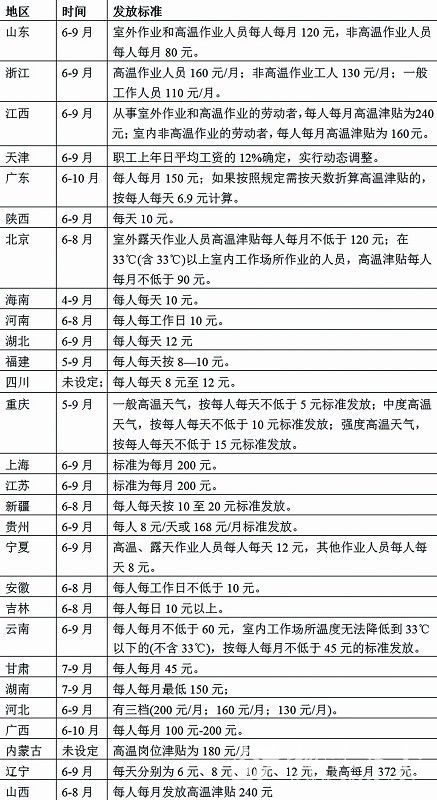 如,北京高溫補貼的發(fā)放時間為每年的6月~8月,發(fā)放標準為:室外露天作業(yè)人員高溫津貼每人每月不低于120元;在33℃(含33℃)以上室內(nèi)工作場所作業(yè)的人員,高溫津貼每人每月不低于90元。